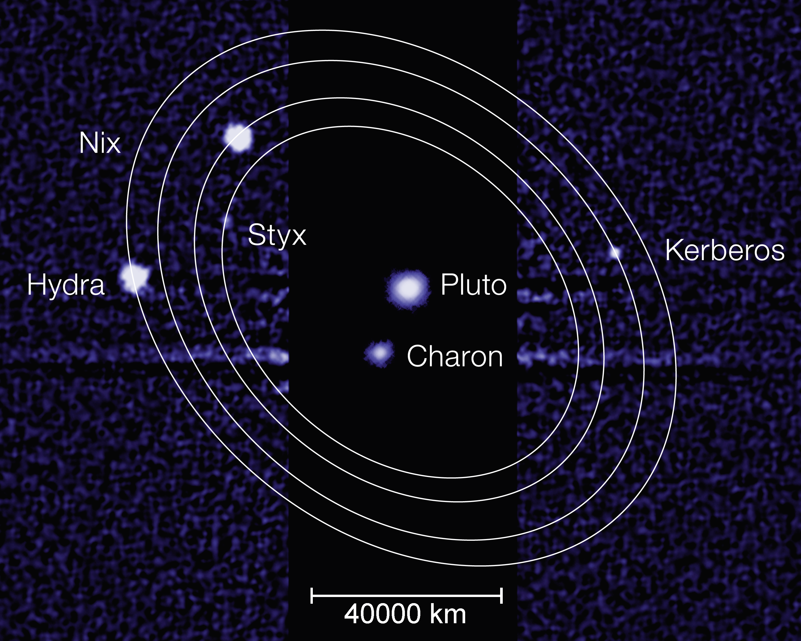 Découverte en 1930, Pluton était considérée comme la neuvième et plus petite planète du Système solaire, titre dont elle a été déchue en 2006. Depuis cette date, Platon n’est plus vraiment une planète, mais forme toutefois avec Charon, sa principale lune, un système planétaire binaire, le seul du système solaire. En effet, la masse de Charon étant environ égale à 11% de celle de Pluton, leur barycentre (centre de masse) est positionné entre les deux (et non à l’intérieur de la plus grande). Depuis une dizaine d’années, les images collectées par le télescope Hubble ont permis de révéler quatre satellites en orbite autour du couple Pluton-Charon : Styx (la moins massive), Nix, Kerberos et Hydra.