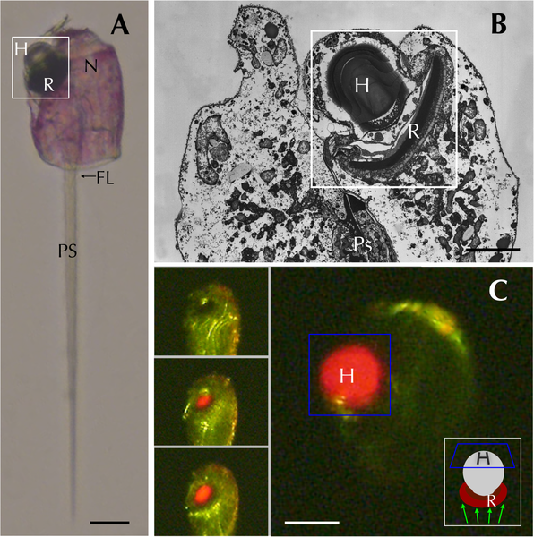 Le dinoflagellé décrit dans l’article appartient à la famille des Warnowiaceae, comprenant trois genres(Warnowia, Erythropsidinium et Nematodinium). Ils présentent des structures appelées les « ocelloïdes ». Ce sont des organites (éléments intracellulaires organisés) au sein desquels on peut distinguer, par analogie, une cornée, un cristallin (lentille réfractive, ici appelé le hyalosome, H) et une région photoréceptrice en forme de coupe bordée de pigments (appelée, en référence à la rétine, le corps rétinien, R). La présence de ces deux derniers éléments, indispensables au fonctionnement de l’œil camérulaire, font de l’ocelloïde un œil de type caméra fonctionnel à part entière.