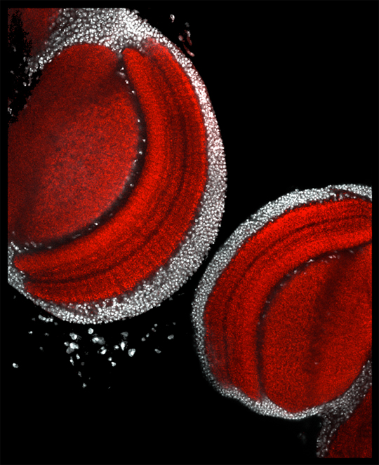 Il s’agit cette fois-ci de drosophile. L’image montre deux sections de lobes optiques, dédiées au traitement des informations visuelles, dans le cerveau de jeunes drosophiles adultes. Les noyaux sont marqués en fluorescence blanche et les prolongements cellulaires des neurones en rouge.