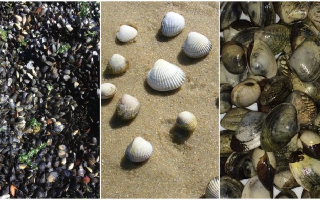 Moules (Mytilus trossulus), Copper Beach, West Vancouver, Canada ; Coques (Cerastoderma edule), Arousa, Galicia, Spain ; palourdes (Polititapes aureus) Arousa, Galicia, Spain.